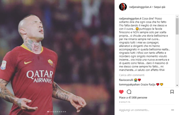 Il centrocampista belga Radja Nainggolan, tramite il proprio profilo Instagram ha voluto salutare la Roma. Di seguito il suo post:...