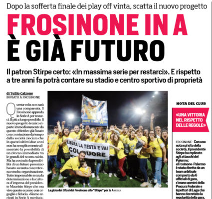 Corriere dello Sport: “Frosinone in A, è gia futuro. Il patron Stirpe certo: «In massima serie per restarci»”