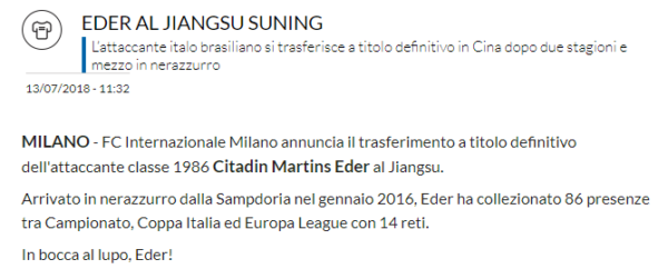 "FC Internazionale Milano annuncia il trasferimento a titolo definitivo dell'attaccante classe 1986 Citadin Martins Eder al Jiangsu. Arrivato in nerazzurro dalla Sampdoria...
