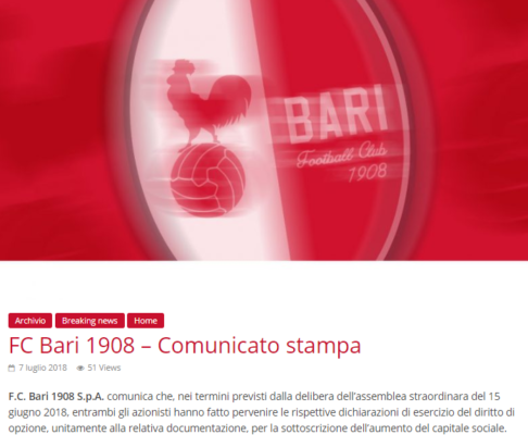 Attraverso il proprio sito ufficiale il Bari comunica di aver sottoscritto l'aumento del capitale nella giornata odierna. Di seguito il...