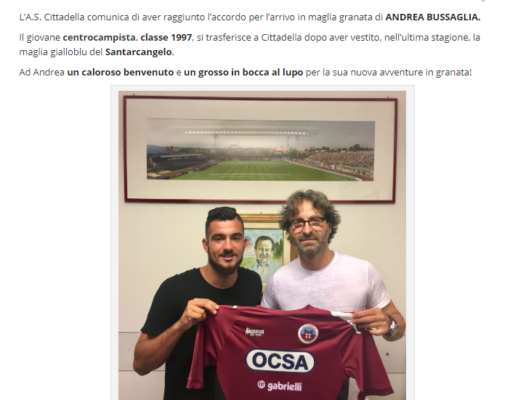 "L’A.S. Cittadella comunica di aver raggiunto l’accordo per l’arrivo in maglia granata di ANDREA BUSSAGLIA. Il giovane centrocampista, classe 1997, si trasferisce a Cittadella...