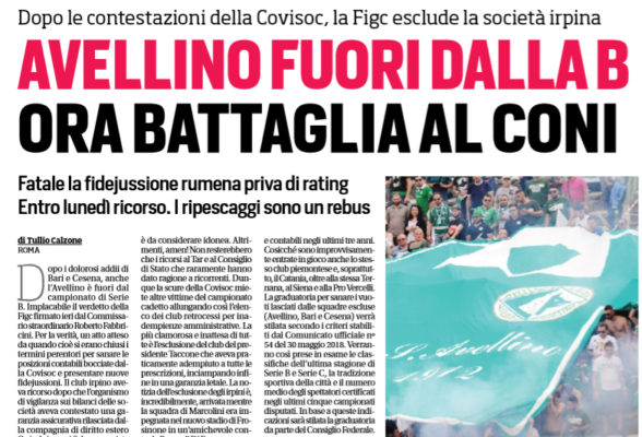 "Dopo i dolorosi addii di Bari e Cesena, anche l’Avellino è fuori dal campionato di Serie B. Implacabile il verdetto...