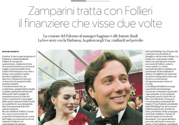 L'edizione odierna de "La Repubblica", ha deciso di parlare della trattativa di Raffaello Folleri per l'acquisto del Palermo, una trattativa...