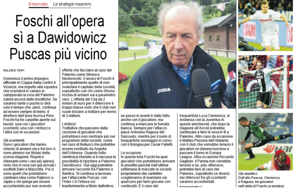 "Attivissimo a Milano il d.s. Rino Foschi nella costruzione del nuovo Palermo. Ai dettagli la trattativa per Puscas (Inter, era...