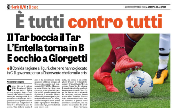 L'edizione odierna de "La Gazzetta dello Sport" ha analizzato il continuo caos in serie B con l'Entella che va verso...