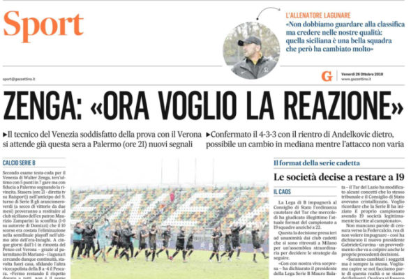 "Secondo esame testa-coda per il Venezia di Walter Zenga, terz'ultimo con 5 punti in 7 gare ma con fiducia a...