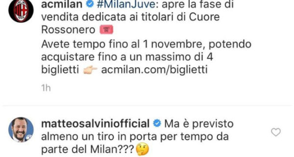 Matteo Salvini ha risposto ironicamente al post del Milan su Instagram, riguardante l'inizio della vendita dei biglietti per la gara...