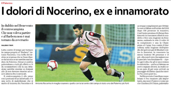 Antonio Nocerino, ex centrocampista del Palermo, rimasto molto legato alla città rosanero, potrebbe dover saltare il match di domani sera ...