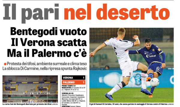 "Nel deserto e nel silenzio del Bentegodi, il Verona rinasce da se stesso proprio nella partita più difficile, senza tifosi...
