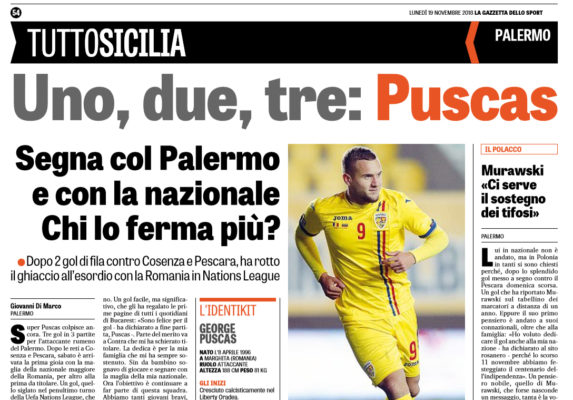 Periodo più che prolifico per Puscas. L'attaccante rosanero dopo i gol col Palermo anche con la Nazionale maggiore della Romania...
