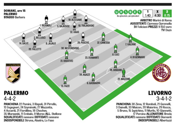 Queste le probabili formazioni di Palermo-Livorno, match valido per la sedicesima giornata di serie B in programma domani alle ore...