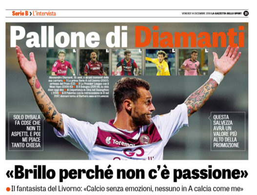 Nell'edizione odierna di "Tuttosport", c'è spazio per un intervista ad Alessandro Diamanti, oggi al Livorno, ma con un passato recente...