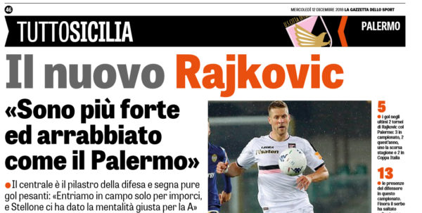 L’edizione odierna de “La Gazzetta dello Sport”, riporta un’intervista dedicata al centrale del Palermo Slobodan Rajkovic. Ecco quanto si legge:...
