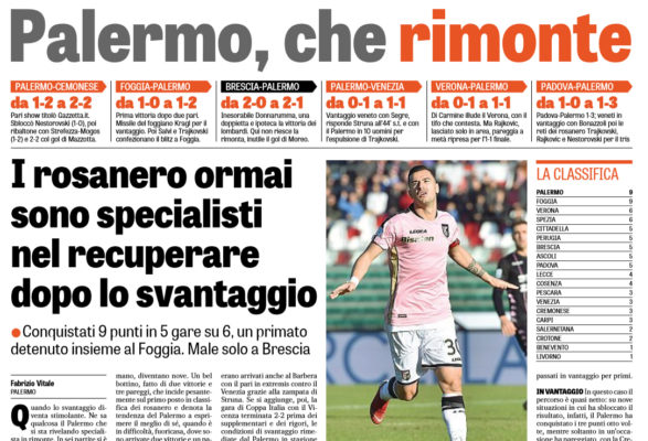 L'edizione odierna de "La Gazzetta dello sport" si sofferma sul carattere mai arrendevole dei calciatori rosanero, abili a rimontare le...