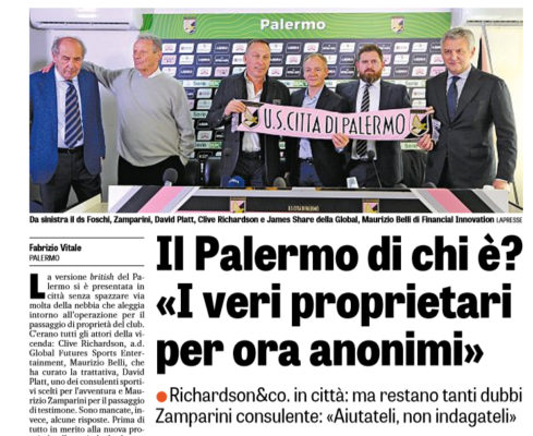 Gazzetta dello Sport: “Fumo da Londra. Palermo, gli uffici della nuova società sono una casella di posta. I dettagli”