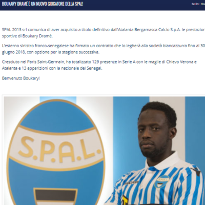 "SPAL 2013 srl comunica di aver acquisito a titolo definitivo dall’Atalanta Bergamasca Calcio S.p.A. le prestazioni sportive di Boukary Dramé. L’esterno...