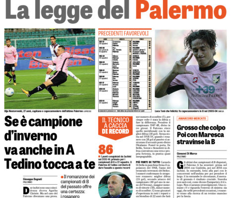 L'edizione odierna de "La Gazzetta dello Sport" dà spazio alla statistica. Storicamente il Palermo laureatosi campione d'inverno, è sempre riuscito...