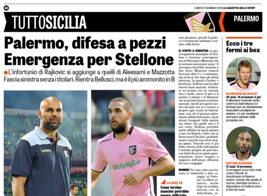 L'edizione odierna de "La Gazzetta dello Sport", si sofferma sull'emergenza di in difesa del Palermo, con Stellone che ritrova Bellusci...
