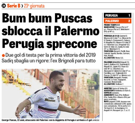 "Nel segno di George Puscas il Palermo (aveva ottenuto un punto nelle prime tre gare del 2019) allontana per un...