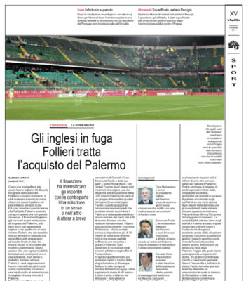 L'edizione odierna de "La Repubblica" approfondisce il caos che sta avvolgendo il Palermo, a partire dalla confermata fuga degli inglesi...