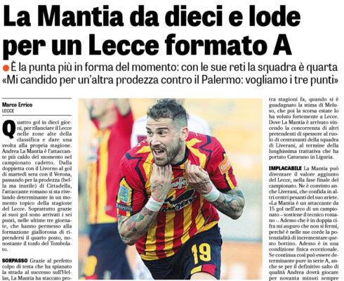 L'edizione odierna della "Gazzetta dello Sport" focalizza l'attenzione sul magic moment di Andrea La Mantia, bomber del Lecce, che ha...