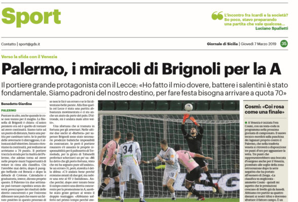 Giornale di Sicilia: “Palermo, i miracoli di Brignoli per la A”