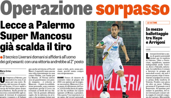 Gazzetta dello Sport: “Operazione sorpasso, Lecce a Palermo. Super Mancosu già scalda il tiro”