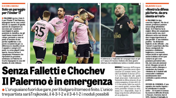 L'edizione odierna della "Gazzetta dello Sport", analizza la situazione in casa Palermo dopo gli ultimi infortuni di Chochev e Falletti....