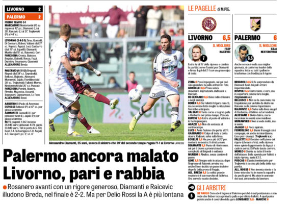 Gazzetta dello Sport: “Brignoli imperdonabile. Le pagelle di Livorno-Palermo” (FOTO)