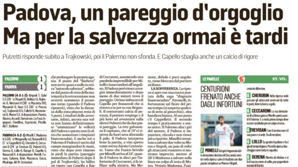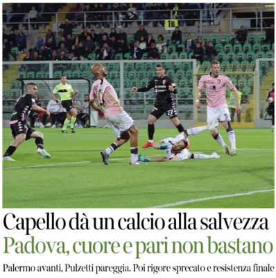 L'edizione odierna del "Corriere del Veneto" si sofferma sulla prestazione del Padova nella sfida esterna contro il Palermo. Il punto...