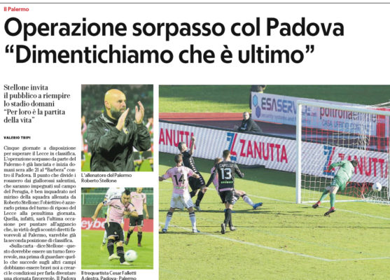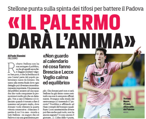 Corriere dello Sport: “«Il Palermo darà l’anima». Stellone punta sulla spinta dei tifosi per battere il Padova”