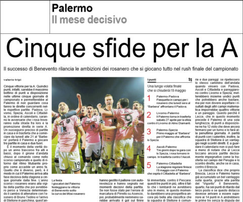L'edizione odierna de "La Repubblica" analizza questo finale di campionato. Cinque sfide restanti. Cinque vittorie che porterebbero al Palermo 15...
