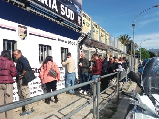 A poco più di un'ora dall'apertura, sono circa trenta i tifosi rosanero in coda al botteghino dello stadio "Renzo Barbera"...
