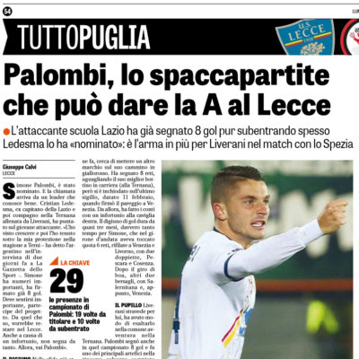 L'edizione odierna della "Gazzetta dello Sport", parla di Simone Palombi, giocatore che può regalare la serie A al Lecce. L'ex...