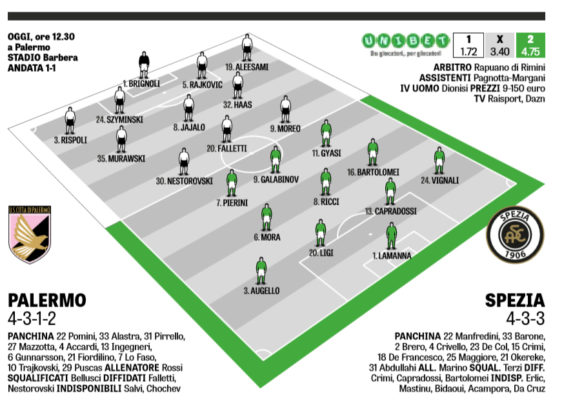 Gazzetta dello Sport: “Palermo-Spezia, le probabili formazioni” (FOTO)