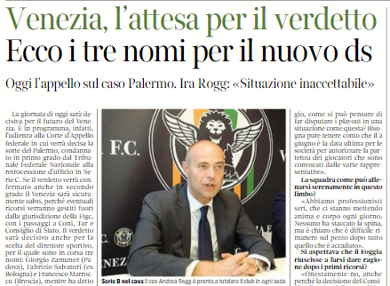 L'edizione odierna del "Corriere del Veneto" riporta l'intervista ad Andrea Rogg, Ceo del Venezia. Se oggi si dovesse ribaltare la...