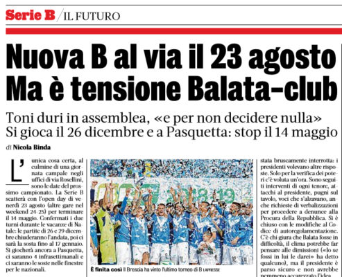 Gazzetta dello Sport: “Serie B, clima da far-west in assemblea. Balata vicino alle dimissioni? «Io se fossi in lui le darei»”