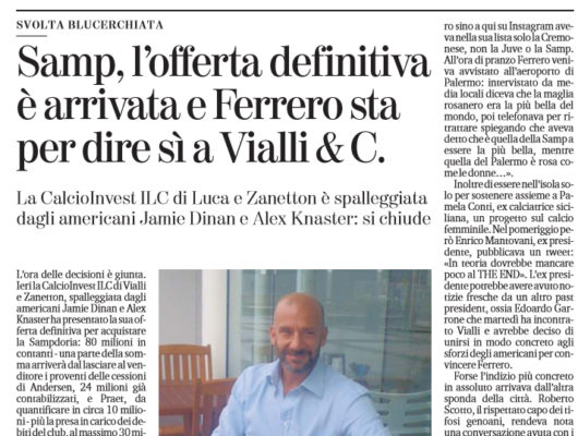 L'edizione odierna de "La Stampa" riporta lo stato avanzato della trattativa tra Ferrero e Vialli per la cessione della Sampdoria....