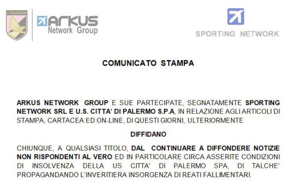 Arkus Network società proprietaria del Palermo Calcio ha voluto diramare una nota in cui comunica che è pronta a diffidare...