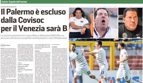 L'edizione odierna de "La Nuova Venezia" si sofferma sul rigetto della domanda di iscrizione del Palermo da parte della Covisoc,...