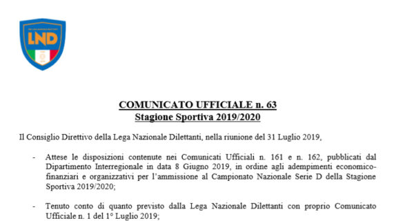 Il Consiglio Direttivo della Lega Nazionale Dilettanti, riunitosi oggi a Roma, ha deliberato in ordine alle ammissioni ai campionati nazionali...