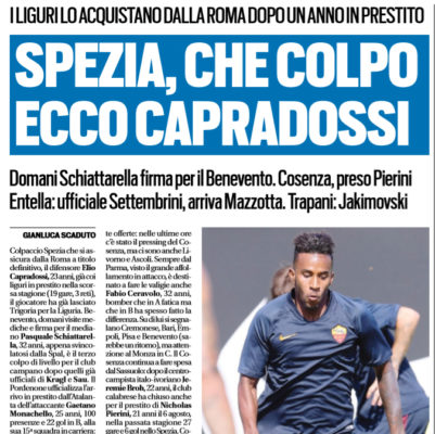 L'edizione odierna di "Tuttosport" fa il punto della situazione per il mercato di serie B. Lo Spezia chiude un grandissimo...