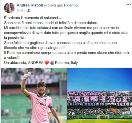 Andrea Rispoli, ex esterno del Palermo, ha pubblicato un post sul proprio profilo Facebook, salutando tutti i tifosi del Palermo...