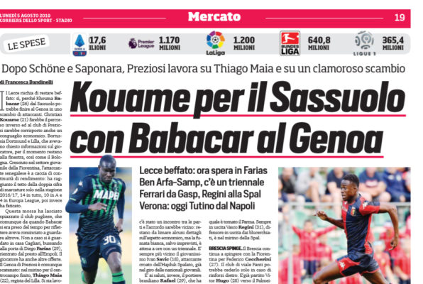 L'edizione odierna del "Corriere dello Sport" analizza le trattative del giorno in Serie A. Ecco quanto riportato: "Il Lecce rischia...