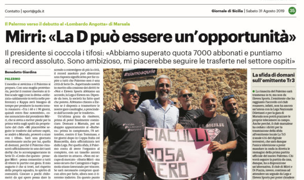 L'edizione odierna del "Giornale di Sicilia" riporta le parole rilasciate dal presidente del Palermo, Dario Mirri, ieri in occasione della...
