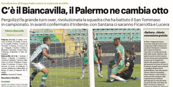 L'edizione odierna del "Giornale di Sicilia" si sofferma sulle probabili formazioni di Palermo-Biancavilla. In basso, le possibili scelte: Palermo (4-3-3):...