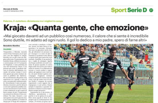 L'edizione odierna del "Giornale di Sicilia" riporta le dichiarazioni di Erdis Kraja, centrocampista del Palermo: «Sicuramente è stata una grandissima...