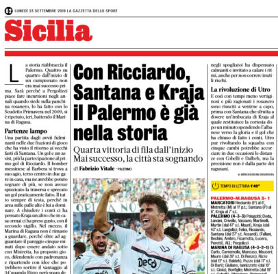 L'edizione odierna della "Gazzetta dello Sport" riporta le parole del tecnico del Palermo Pergolizzi a proposito del record di quattro vittorie consecutive...