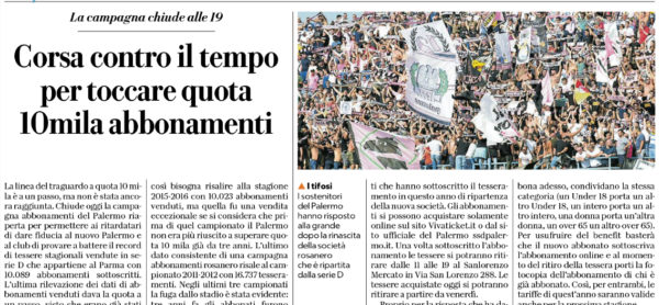 L'edizione odierna de "La Repubblica" si sofferma sulla campagna abbonamenti del Palermo. La linea del traguardo a quota 10 mila...