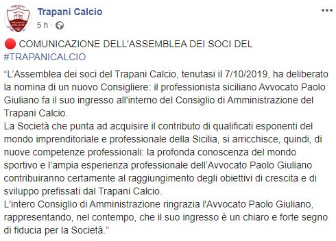 Nuovo ingresso nel Consiglio d'amministrazione del Trapani. Il club granata annuncia, tramite la propria pagina Facebook, che l'avvocato Paolo Giuliano...